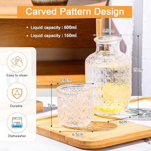 Chase Chic - طقم إبريق وكوب زجاجي سيرشي ليلي من شفشق سعة 590 مل وكوب سعة 160 مل، إبريق ماء زجاجي مع كوب لجانب السرير والمطبخ بنمط زهرة التفاح البري من تشيس شيك