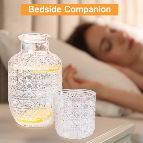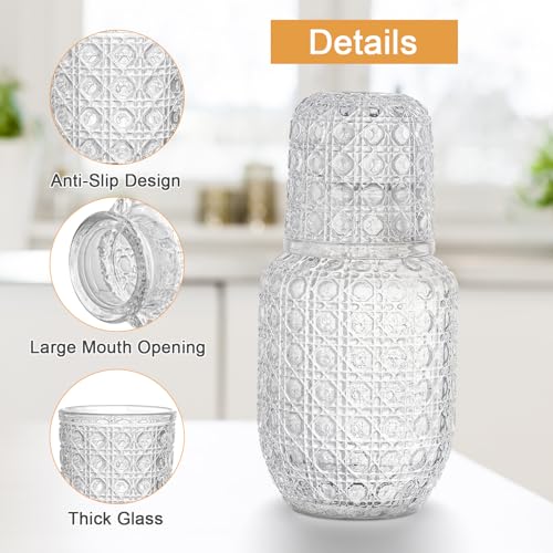 - مادة آمنة ومتينة: طقم الإبريق الليلي هذا مصنوع من زجاج سميك، مما يضمن السلامة والمتانة. مصنوع من مواد آمنة غذائيًا، الإبريق الزجاجي مع الغطاء مقاوم للحرارة وآمن للغسل في غسالة الأطباق، مما يجعل التنظيف سهلاً. بفضل تصميمه الشفاف، فإنه يضيف لمسة أنيقة إلى طاولة السرير الخاصة بك مع توفير الراحة للاستخدام اليومي.