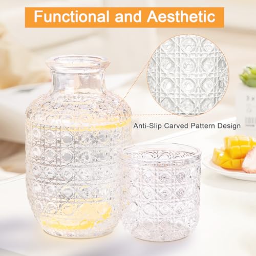 - عرض خيارات التصميم - متوفر بثلاثة أنماط ساحرة مختلفة، يتميز كل من إبريق العصير الزجاجي والكوب بنقوش معقدة على سطحهما، مما يجعله قطعة مركزية أنيقة لطاولتك. بالإضافة إلى ذلك، يمكن أن تعمل هذه الزجاجة الأنيقة أيضًا كمزهرية صغيرة لطيفة، مما يضيف الجمال إلى كل ركن من أركان منزلك.