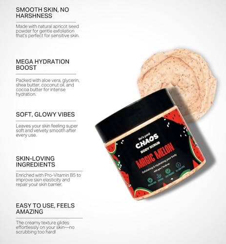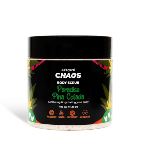 Chaos - مقشر الجسم بخلاصة رائحة استوائية بينا-كولادا وتركيبة تقشير طبيعية، مسحوق بذور المشمش مع مزيج ترطيب ثلاثي (زبدة الشيا/زيت جوز الهند/زبدة الكاكاو)، مخصص للبشرة الحساسة من كيوس بارادايس، 400 جم