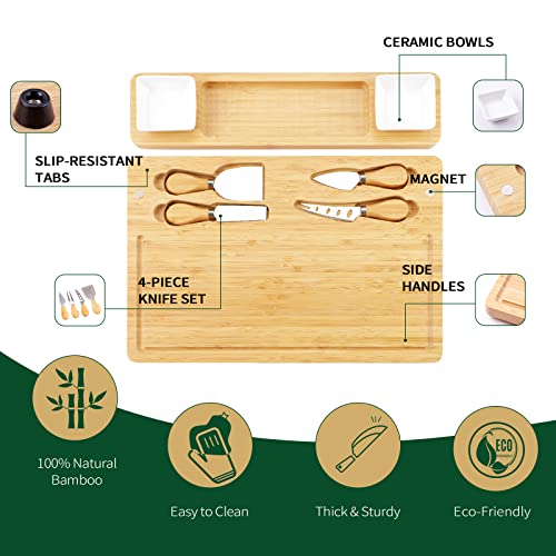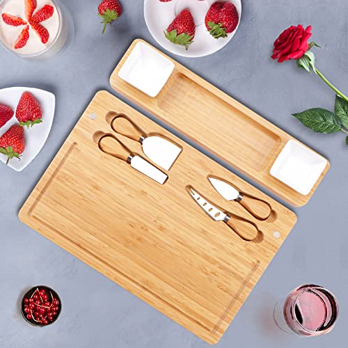 BEAUPLUS - طقم لوح تقديم المقبلات، لوح أجبان مع طقم سكاكين ووعاءين من السيراميك، صينية تقديم من خشب البامبو، هدية فريدة لحفلات الزفاف، الانتقال لمنزل جديد، وأعياد الميلاد