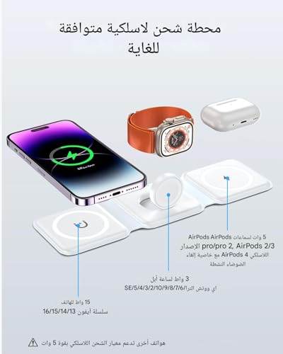 - 【توافق واسع】شحن سريع 15 وات/7.5 وات متوافق مع آيفون 14/15/13/12/11 برو/برو ماكس/14 بلس/13 ميني/12 ميني/XS ماكس/XR/XS/X/8/8 بلس؛ شحن 2.5 وات لساعة آبل ووتش 9/8/7/6/5/4/3/2/الترا (غير متوافق مع ساعة جالاكسي)؛ شحن 5 وات لسماعات ايربودز برو 2/برو/3/2؛ شحن سريع 10 وات/15 وات لموبايل سامسونج جالاكسي S23/S22/S21/S10/S9/S8/S7، نوت 20/10/9/8؛ 10 وات/5 وات متوافق مع جوجل بيكسل؛ ال جي وجميع الهواتف التي تدعم الشحن اللاسلكي.