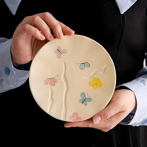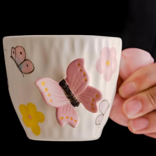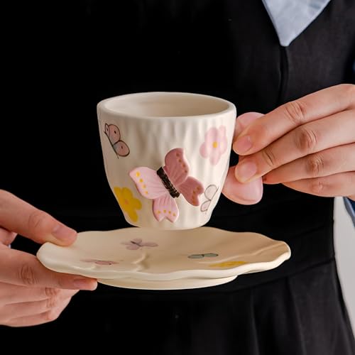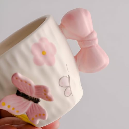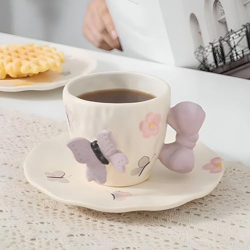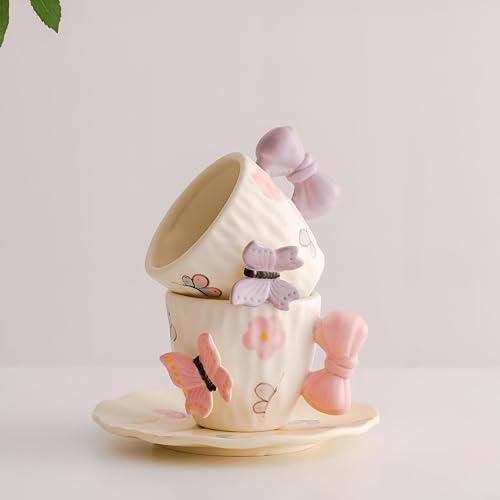 Generic - مجموعات سيراميك ساحرة - تصاميم فيونكة مرسومة باليد للبنات، اكواب شاي بينك 230 مل مع صحون، مثالية للافطار او شاي بعد الظهر (قطعة واحدة)