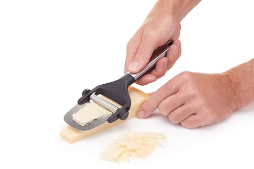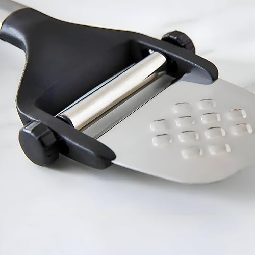 - تمنحك آلية التقطيع القابلة للتعديل تحكماً دقيقاً في السماكة، مما يتيح لك ابتكار قطع سميكة للجبن الصلب أو رقائق رقيقة جداً كالأوراق للأصناف القابلة للتفتت، كل ذلك بأداة واحدة ذكية