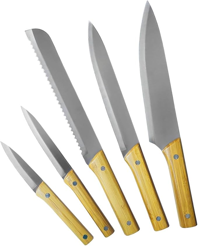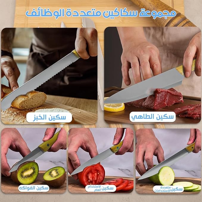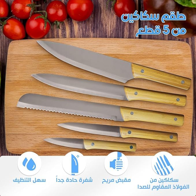 - مجموعة سكاكين كاملة من 5 قطع - تتضمن سكاكين مطبخ أساسية لجميع احتياجات الطبخ الخاصة بك: سكين الشيف وسكين التقطيع وسكين الخبز وسكين متعددة الاستخدامات وسكين التقشير.