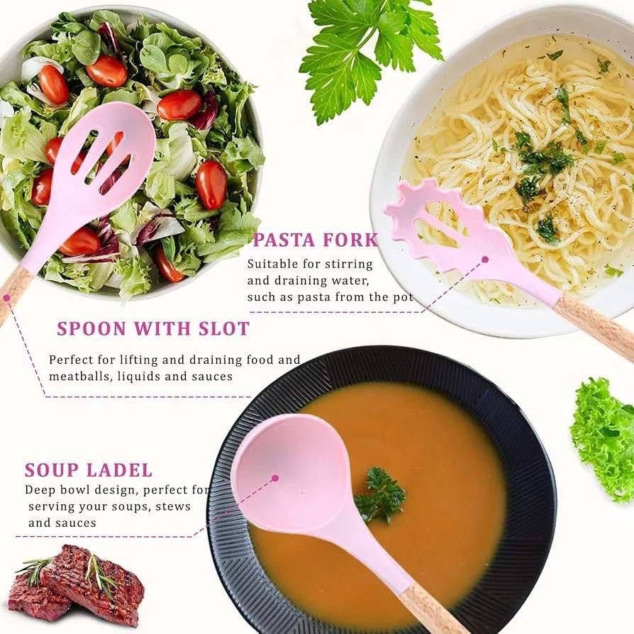 - يحتوي الطقم على خمس سكاكين ومقص وفرشاة توزيع وبلانشة تقطيع ومضرب سيليكون ومعالق وشوارق وحامل التوزيع.