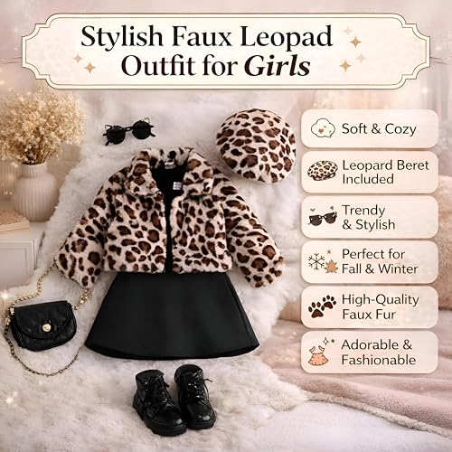 Generic - طقم جيبة فرو أنيق، جاكيت فرو صناعي بنقشة جلد الفهد مع جيبة سوداء وطاقية بيريه مطابقة ونظارات شمس عصرية واكسسوارات جريئة، مثالي لإطلالات سهرة راقية ومظهر عصري غير رسمي