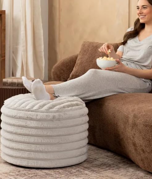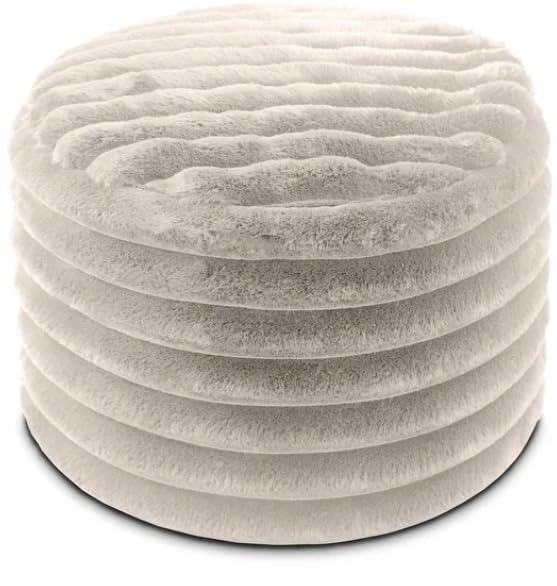 - تصميم أنيق: يتميز مسند القدم الدائري الأنيق بتنجيد فاخر من الفرو الصناعي المضلع باللون الرمادي العاجي الراقي، مما يضيف لمسة من التألق إلى غرفة المعيشة أو غرفة النوم أو منطقة الزينة