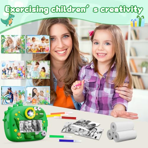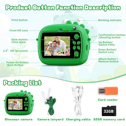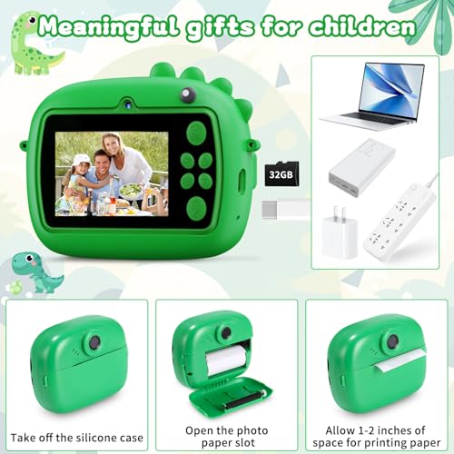 Huifoo - كاميرا أطفال فورية رقمية بشاشة مقاس 2.4 بوصة، كاميرا فيديو على شكل ديناصور للأطفال، دقة 1080 بكسل HD عالية الدقة، طباعة فورية للصور مع بطاقة 32 جيجابايت و3 لفات من ورق الطباعة، هدية لعمر 3-14 سنة