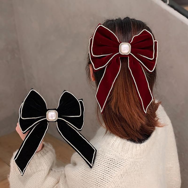 CHIROGRAPHY - مشابك شعر من القطيفة على شكل فيونكة، مرصعة باللؤلؤ وحجر الراين بتصميم فيونكة فرنسية، اكسسوارات تصفيف شعر للنساء والبنات لحفلات الهالوين والكريسماس من تشيروجرافي مجموعة من لونين (قطعتان) بحجم كبير