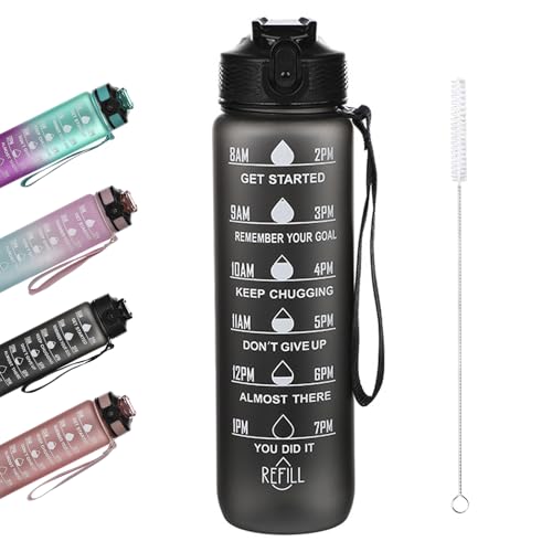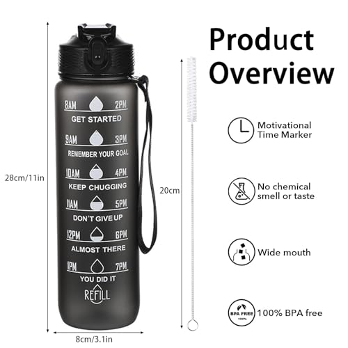 chongning - زجاجات مياه رياضية سعة 1 لتر مع شفاطة ومؤشر للوقت وغطاء مانع للتسرب من البلاستيك، زجاجة مياه خالية من مادة بيسفينول أ شرب للبنات والأولاد للجيم وركوب الدراجات والمكتب من تشونجنينج (أسود)