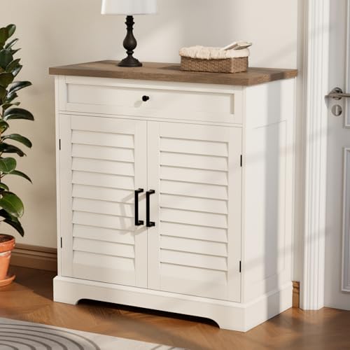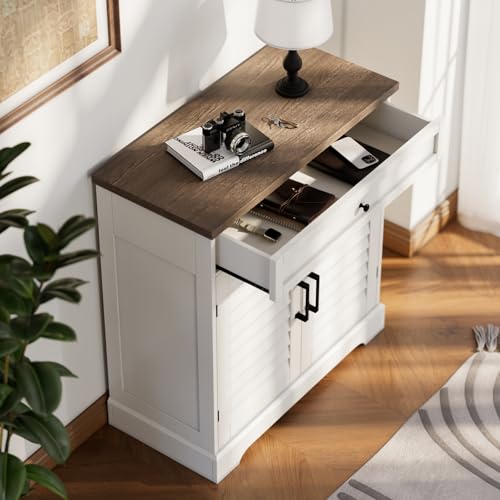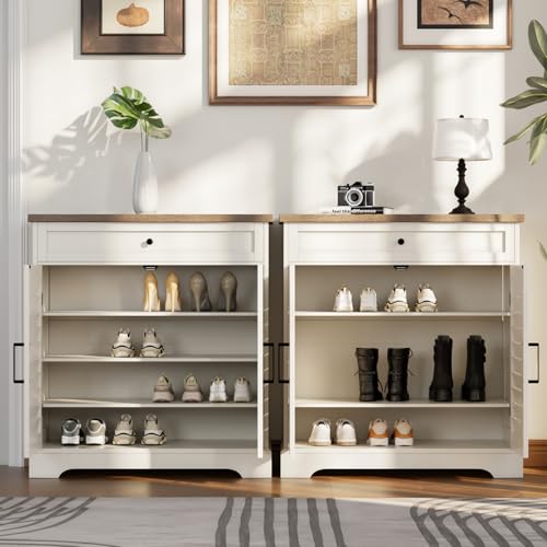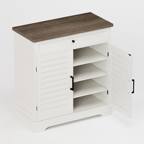 ChooChoo - جزامة أحذية بتصميم ريفي مع أبواب، خزانة تخزين أحذية من 4 طبقات مزودة بدرج ورفوف، منظم أحذية خشبي للمدخل والرواق والخزانة، أبيض وبني ناعم من تشو تشو