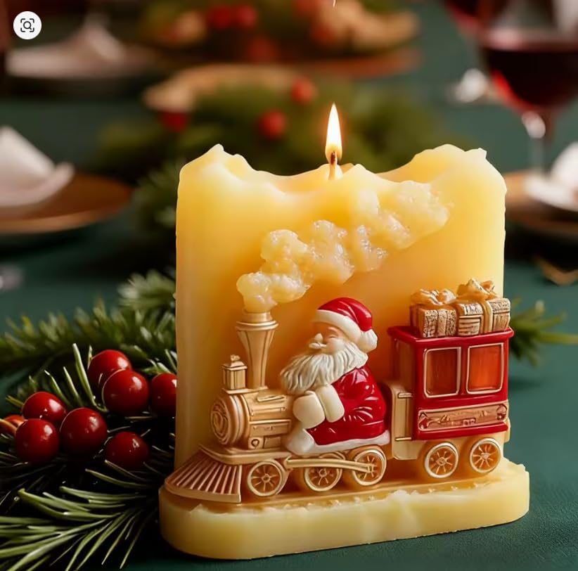 - تصميم ثلاثي الأبعاد: قوالب شمع مصممة بدقة عالية تظهر تفاصيل رائعة لسانتا كلوز، الهدايا، وقطار العيد لإضافة جو احتفالي مميز