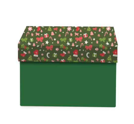 Generic - صندوق هدايا الكريسماس، صندوق تخزين مزخرف مع غطاء بنمط العطلات، قاعدة خضراء بتصميم أشجار الكريسماس والأقواس، مقاس (25 × 18 × 9 سم)
