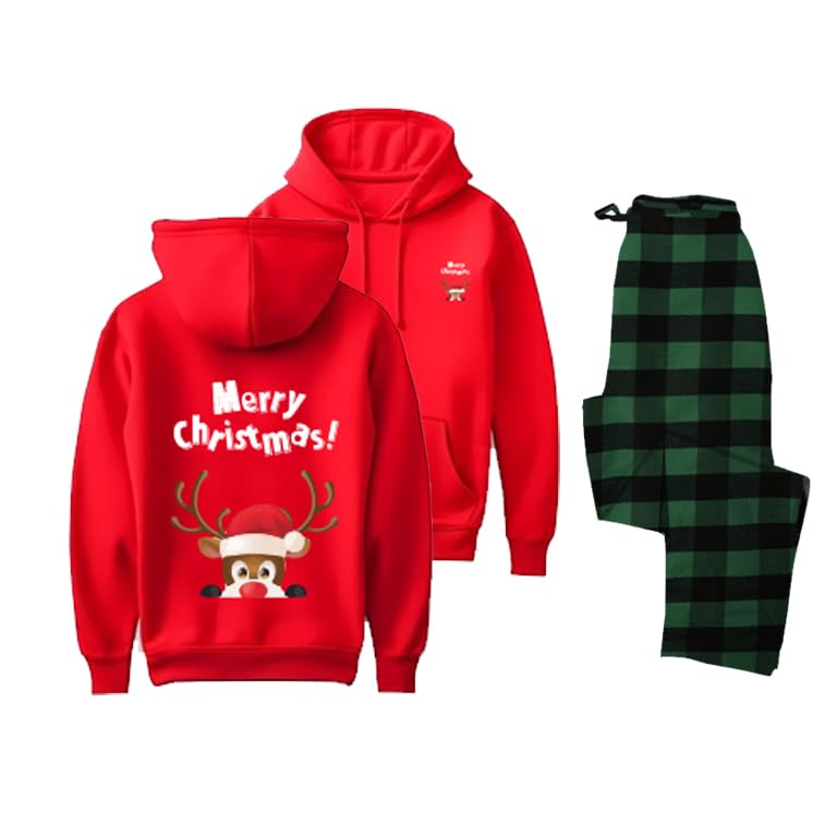 Generic - طقم بيجامة عطلة الكريسماس، سويت شيرت بغطاء راس احمر بتصميم حيوان الرنة وسروال اخضر منقوش، ملابس نوم شتوية مقاس (2XL)