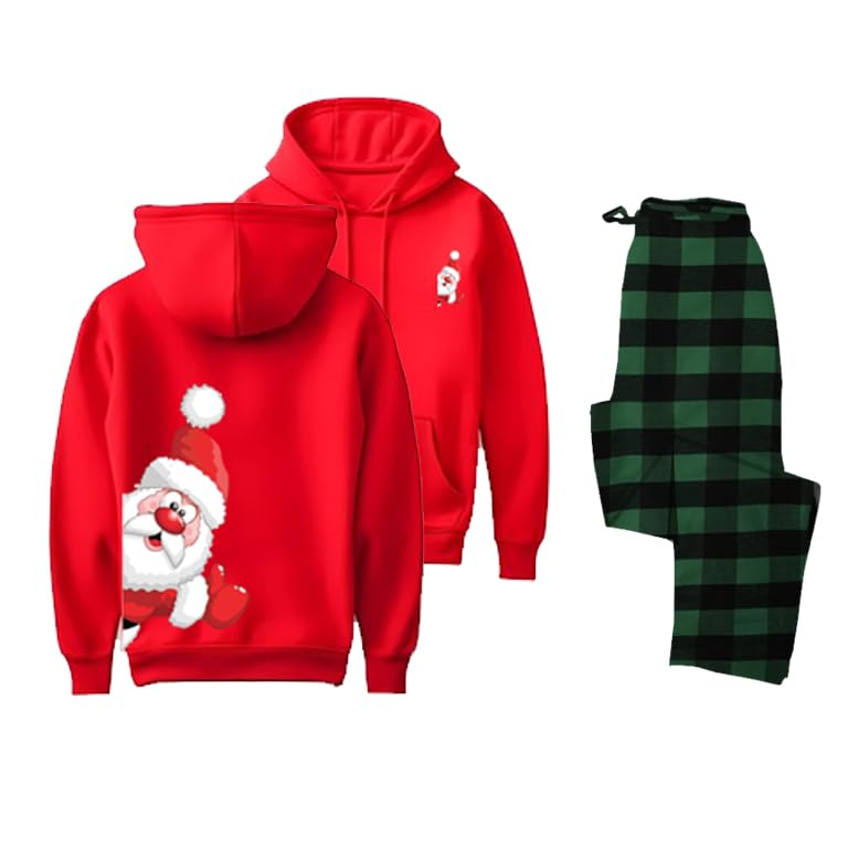Generic - طقم هودي وسروال للكريسماس، هودي سانتا كلوز احمر مع سروال اخضر منقوش، زي العطلات مقاس (XL)