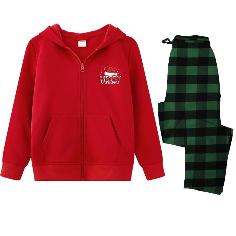 Generic - طقم بيجامة للكريسماس، هودي احمر مع طباعة عيد ميلاد سعيد وسروال بنمط مربعات خضراء، قطعتين مقاس (S)