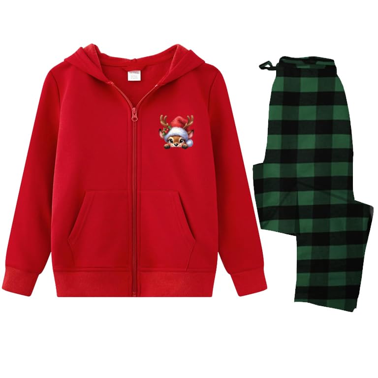 Generic - طقم بيجامة للكريسماس مكون من جاكيت بلون أحمر بغطاء للرأس مطرز بصورة غزال الرنة وبنطلون أخضر بنقشة مربعات، مقاس (لارج L)