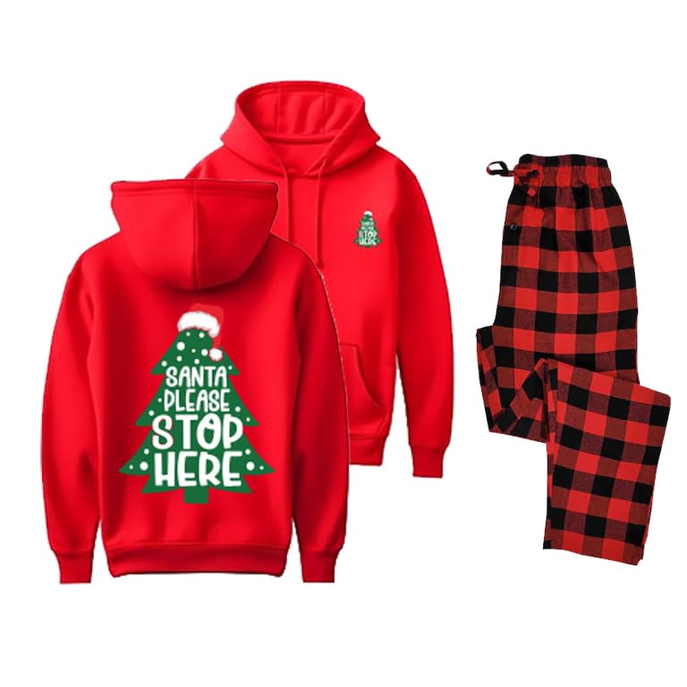 Generic - طقم بيجامة للكريسماس، هودي احمر مع طباعة شجرة سانتا الرجاء التوقف هنا، سروال منقوش مقاس (M)