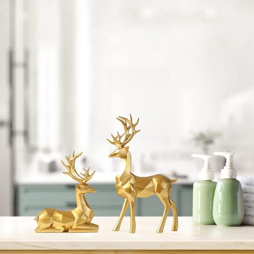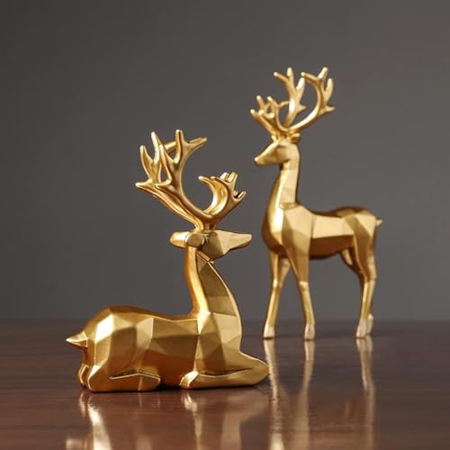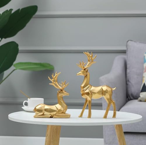 Joschapeau - تماثيل غزلان الكريسماس، تماثيل غزلان من الراتنج (أحدهم جالس والآخر واقف)، تماثيل أيل لتزيين العطلات لغرفة المعيشة وغرفة النوم ومكتب العمل وطاولة الطعام (لون ذهبي)، عبوة من قطعتين