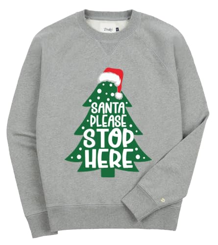 Generic - سويت شيرت للكريسماس بتصميم سانتا الرجاء التوقف هنا، بلوفر من مزيج القطن الرمادي للعطلات، طباعة رسومات شجرة احتفالية مقاس (S)