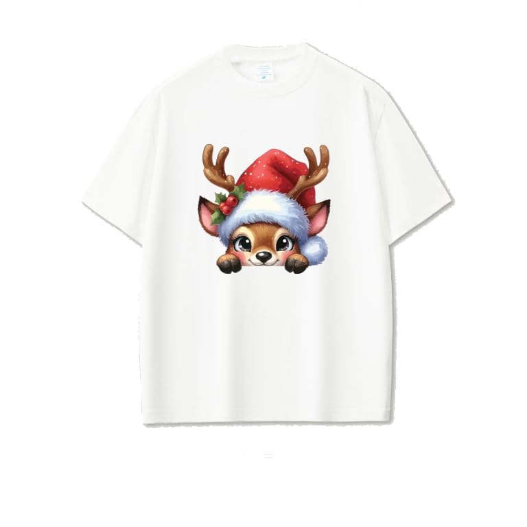 Generic - تي شيرت كريسماس بتصميم حيوان الرنة لطيف، قطن ابيض، قبعة سانتا موضوع العطلات، مقاس (6-9 سنوات)