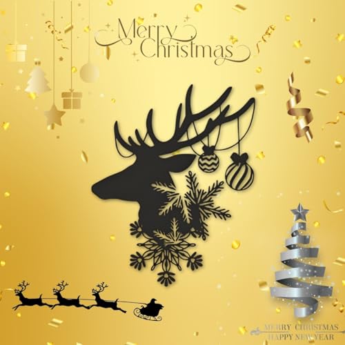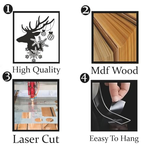 - عناصر التصميم: تصميم لحيوان الرنة من خشب ليفي متوسط الكثافة باللون الأسود مزينة بأنماط ندفة الثلج المعقدة وزخارف زينة للمسة سحرية احتفالية.