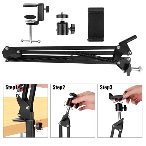 - حامل فيديو علوي للموبايل - حامل تعليق الموبايل بذراع مقص يأتي مع مشبك موبايل وحامل كاميرا برأس كروي يناسب الموبايل الخلوي والفيديو والبث المباشر والخبز والحرف اليدوية وغيرها من الأجهزة مع فتحة خيط 1/4.