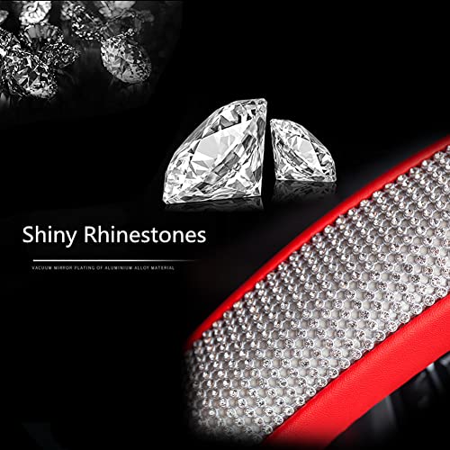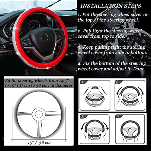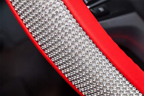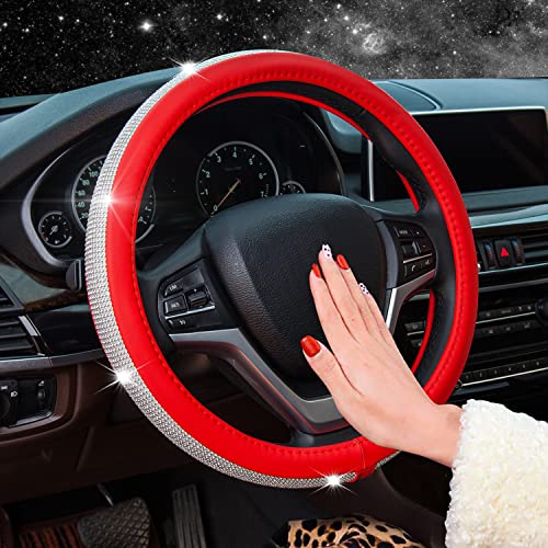 ChuLian - غطاء جلد جديد لطارة الدركسيون مزين بالماس وأحجار الراين بنمط بلينج بلينج كريستالي، ملاءمة شاملة مقاس 38 سم حامي لطارة دركسيون السيارة للبنات والنساء - لون أحمر