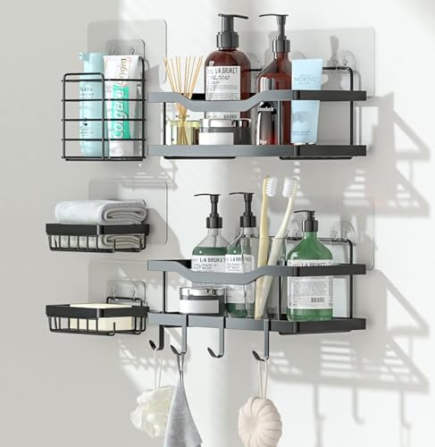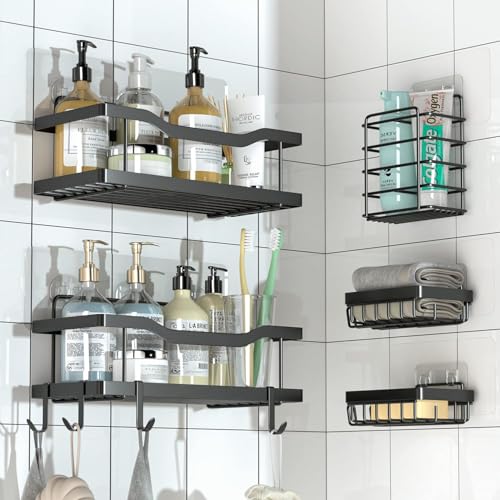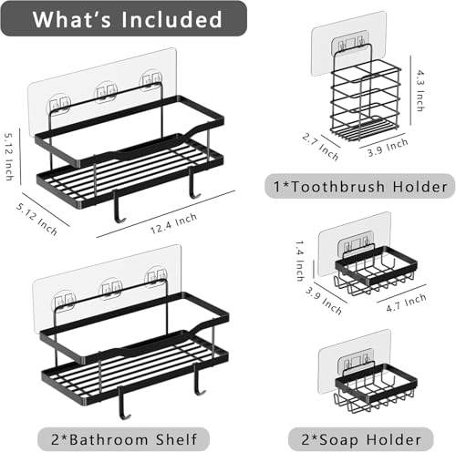Circle M - علبة دش لاصقة سوداء من سيركل ام، عبوة من 5 قطع: منظم حمام من الفولاذ المقاوم للصدأ بـ4 خطافات