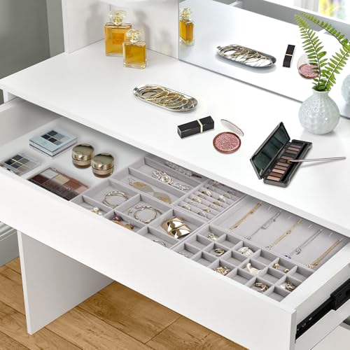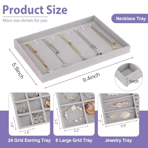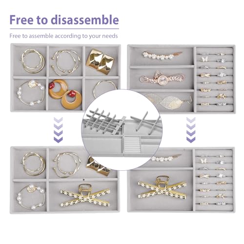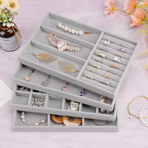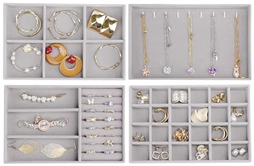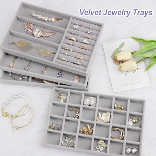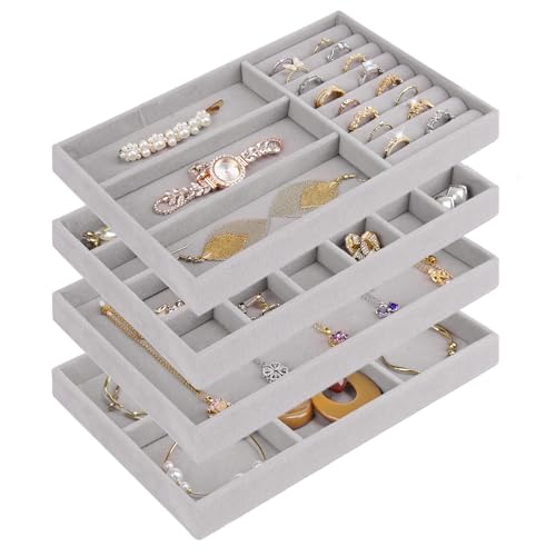 Cirhy - طقم صينية تنظيم مجوهرات قابل للتكديس للأدراج، منظمات مجوهرات مع شنطة للعرض قطيفة لتنظيم السلاسل والأساور والحلقان للنساء من سيرهي، 4 قطع، رمادي