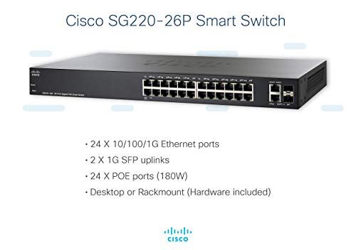 Cisco - مفتاح تحويل ذكي مع 26 منفذ إيثرنت جيجابت (GbE) و2 منفذ إيثرنت جيجابت مجمعين وطاقة عبر الإيثرنت (PoE) بقدرة 180 وات، وحماية مدى الحياة محدودة (SG220-26P-K9-NA) من سيسكو، بلون أسود - SG220-26P