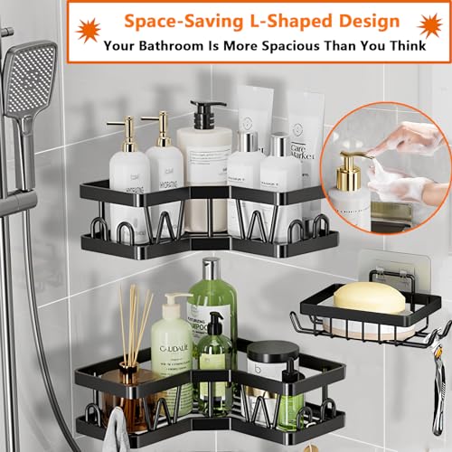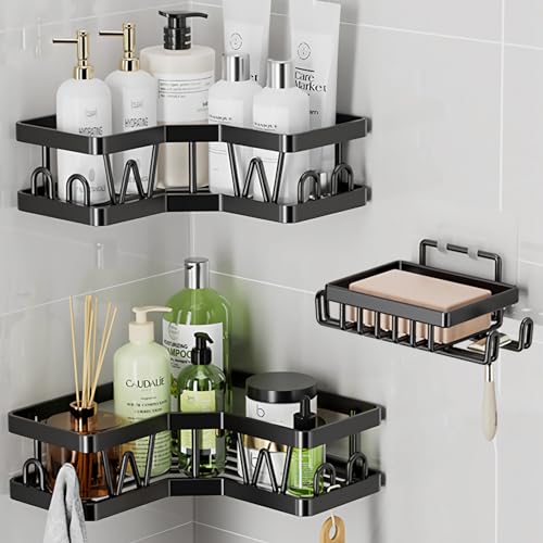 CIT ZCFYU - منظم زاوية للدش لاصق يثبت على الحائط للحمام لا يحتاج للثقب من الفولاذ المقاوم للصدأ بتصميم سلة مع 12 خطاف من سيت زيفيو - أسود من 3 قطع