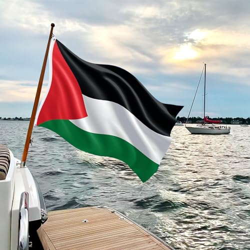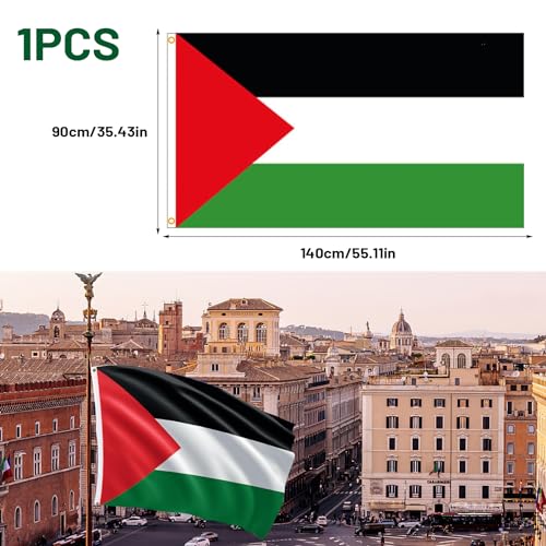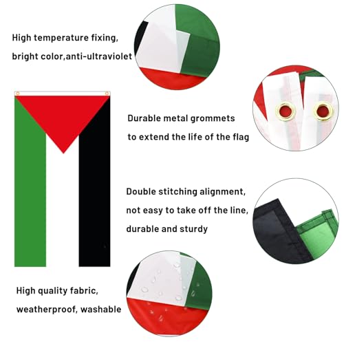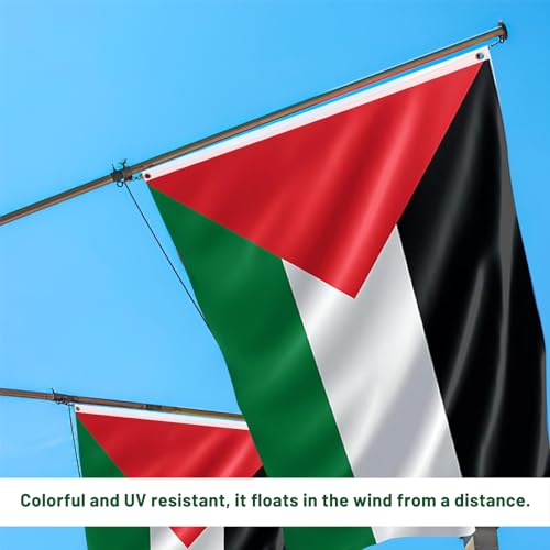 - تصميم متين: علم فلسطين مجهز بدرزات مزدوجة وحواف معززة ومجهز بفتحات معدنية يمكن ربطها بسهولة بسارية العلم أو الشرفة لضمان أن علمك مستقر ومتين ولا يتلف بسهولة.