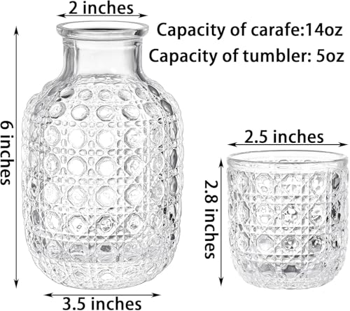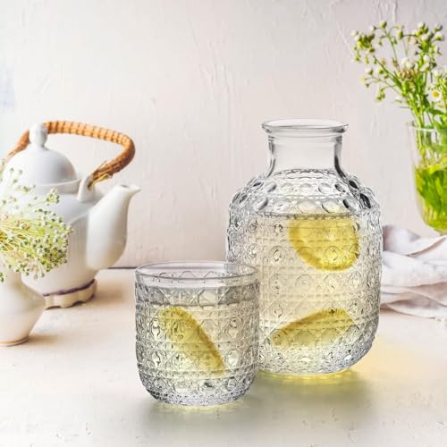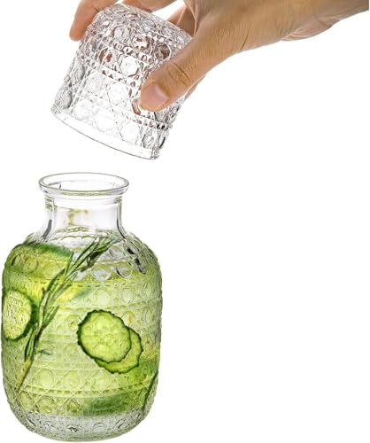 - نمط رائع: يتميز إبريق العصير الزجاجي والكوب بأنماط منحوتة رائعة على السطح، أنيقة بما يكفي لتكون قطعة مركزية لمكتبك. يمكن أن تكون الزجاجة الأنيقة أيضًا مزهرية صغيرة لطيفة لكل منزل في منزلك.