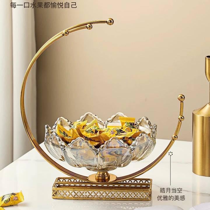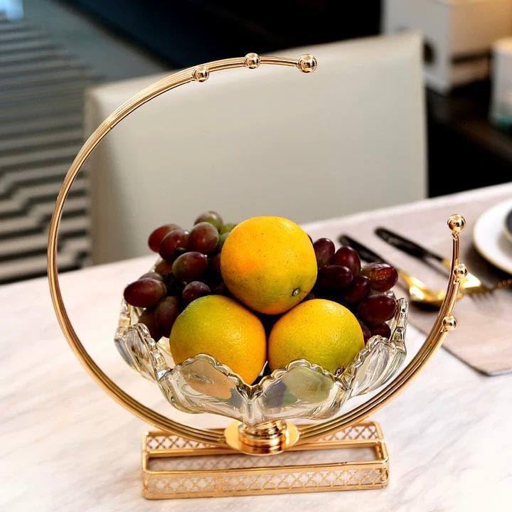 - تصميم فاخر: حامل فاكهة أنيق بإطار ذهبي وقاعدة مزخرفة، يضيف لمسة من الأناقة لأي طاولة طعام