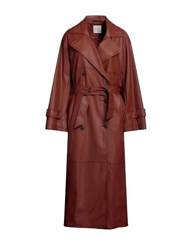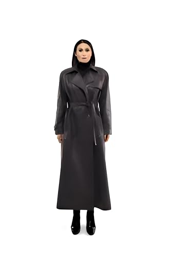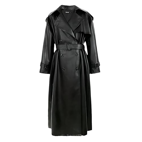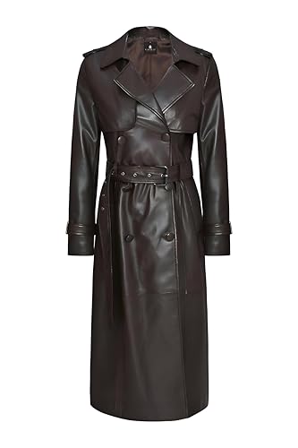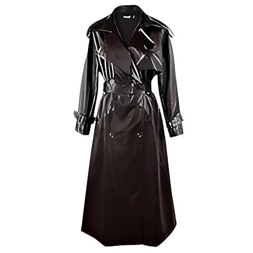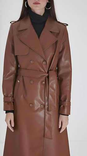 Generic - معطف كلاسيكي للنساء من الجلد الصناعي - معطف طويل بني بتصميم مزدوج الصدر وحزام، طبقة خارجية انيقة للمواسم الباردة والارتداء اليومي