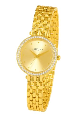 Generic - ساعة يد نسائية كلاسيكية، إطار ذهبي مرصع بالكريستال، سوار معدني ٢٠ سم، مينا ذهبية، حركة كوارتز