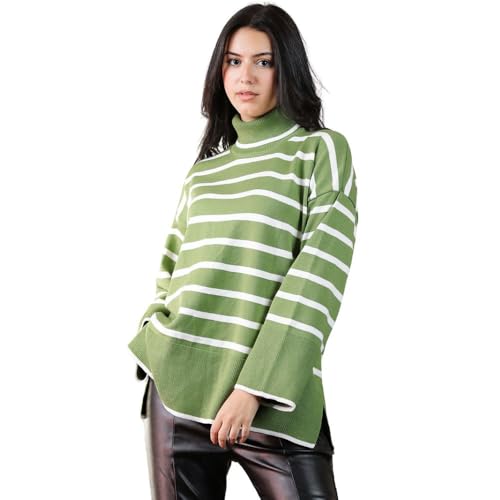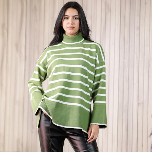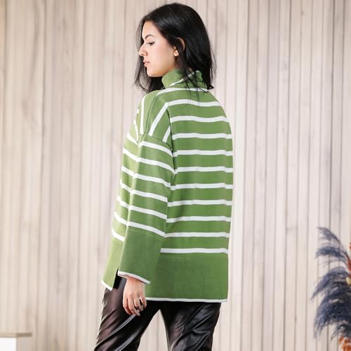 FRIDAYIN - بلوفر كلاسيكي كاجوال بياقة عالية ومخطط بألوان متباينة وأكمام واسعة