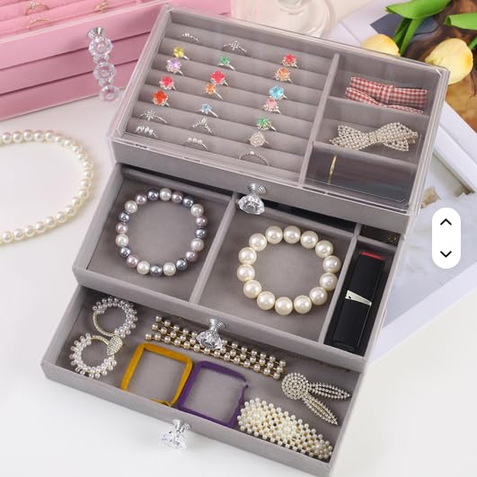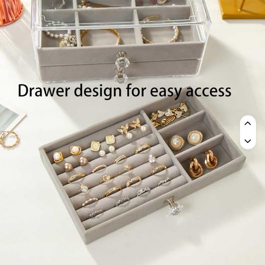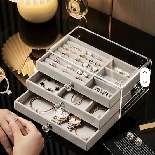 Generic - صندوق منظم مجوهرات أكريليك شفاف بـ 3 أدراج مبطنة قطيفة، مناسب لتخزين للحلقان والخواتم والدلايات والساعات والملحقات، رمادي