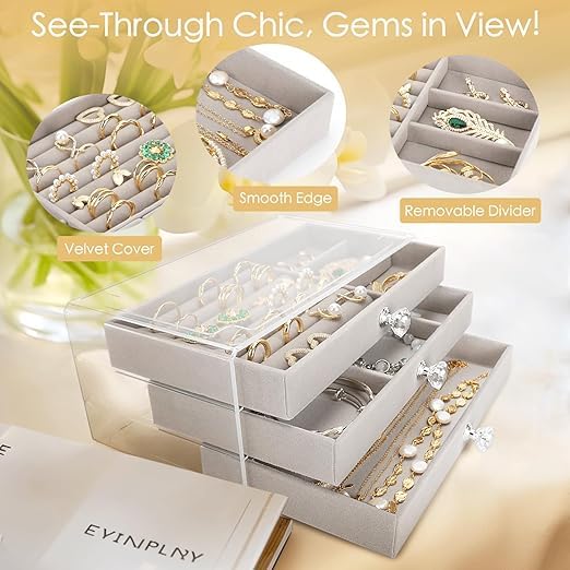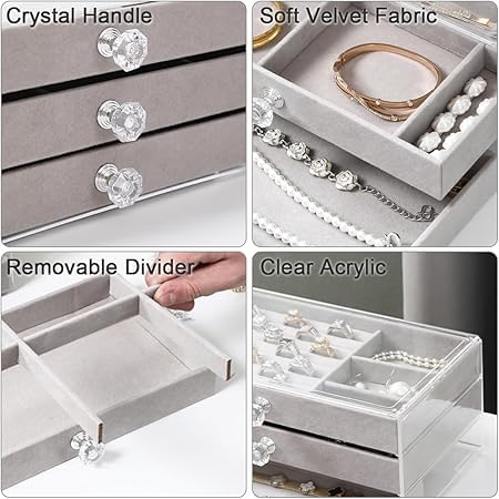 - ✅ 3 أدراج واسعة وقابلة للتعديل – توسعة أنواع مختلفة من الإكسسوارات مثل الخواتم، القلائد، الساعات، الأساور، والحلقان.