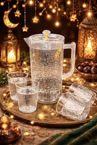 - طقم شربات فاخر: دورق أكريليك بسعة لتر مع 4 أكواب، تصميم شيك وأنيق مثالي لتقديم المياه والعصائر في المناسبات والاستخدام اليومي
