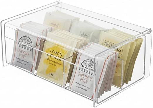 - 6 أقسام عملية لتنظيم مثالي يحتوي الصندوق على ستة مساحات تخزين منفصلة تساعدك على ترتيب أكياس الشاي بنكهات مختلفة بشكل منظم ومرتب. كل قسم يوفر مساحة مناسبة تمنع تداخل الأكياس، مما يسهل الوصول إليها ويحافظ على شكل أنيق داخل الخزانة أو على سطح المطبخ.