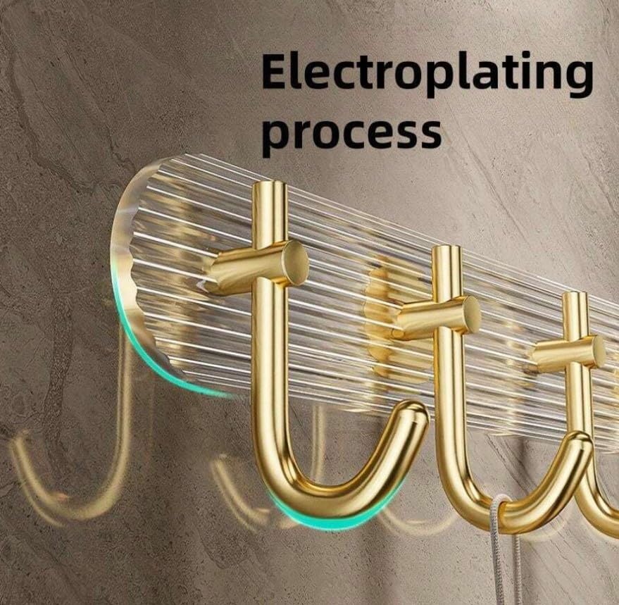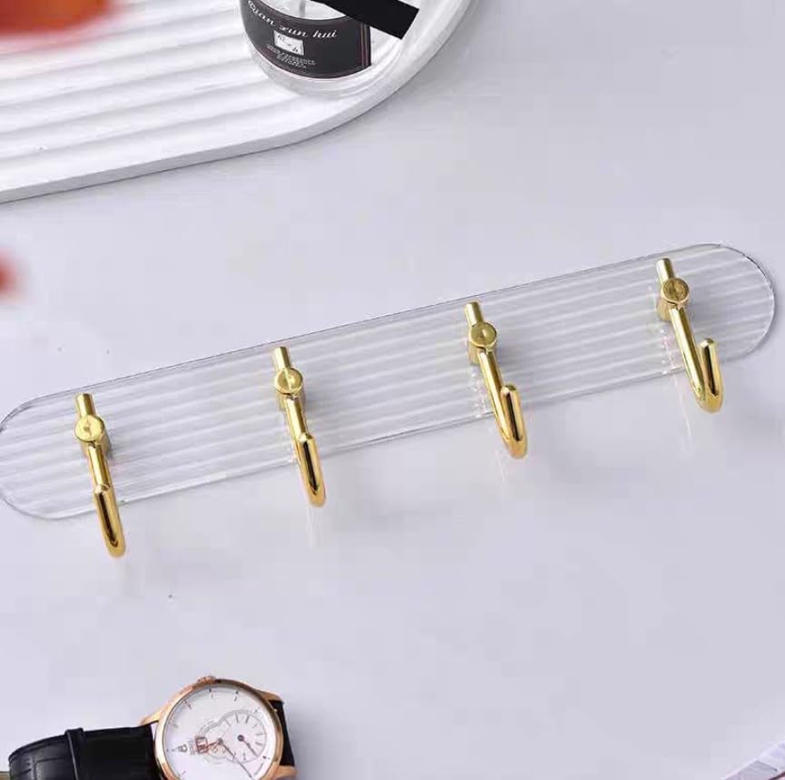 - تصميم فاخر: رف اكريليك شفاف مثبت على الحائط مع 4 خطافات أنيقة مطلية باللون الذهبي، يجمع بين الجمال الحديث والوظائف العملية.