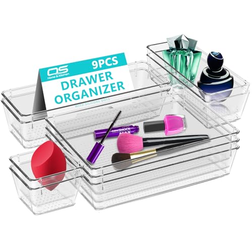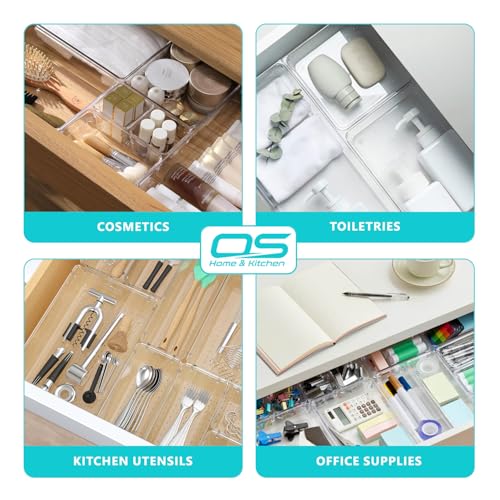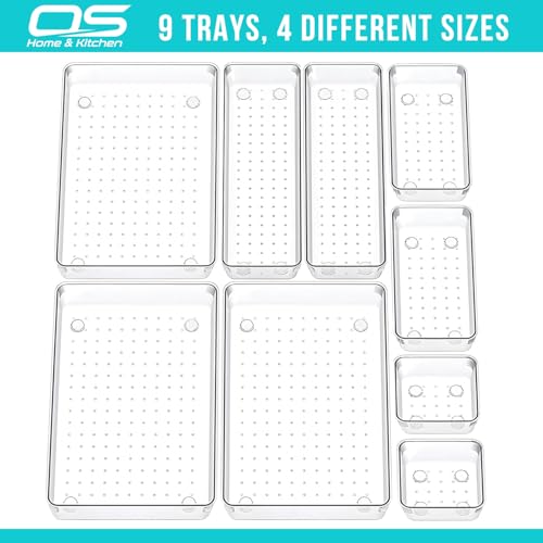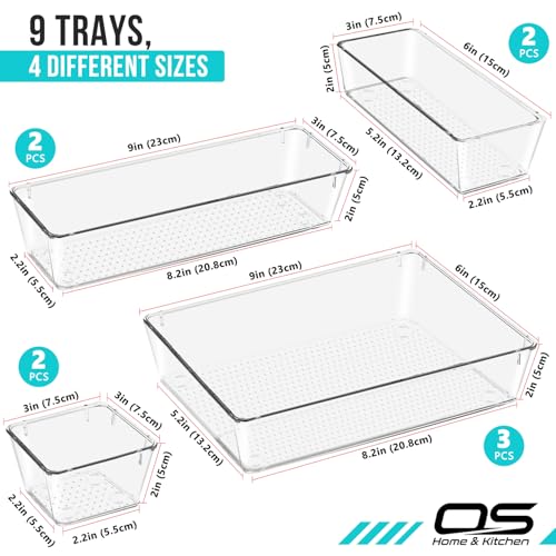 OZE SPORTS - مجموعة صواني تنظيم الأدراج الشفافة، منظم مكياج للأدراج، وحدة تخزين متعددة الاستخدامات للمكياج ومستحضرات التجميل والأدوات لغرفة النوم والمكتب والمطبخ، مقسم لأطقم أدوات المائدة، 4 أحجام، 9 قطع