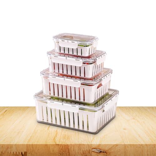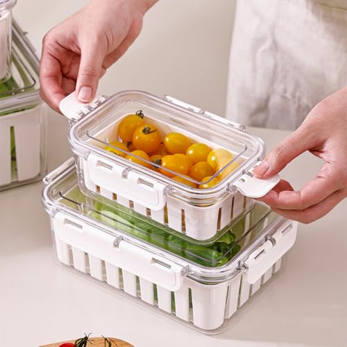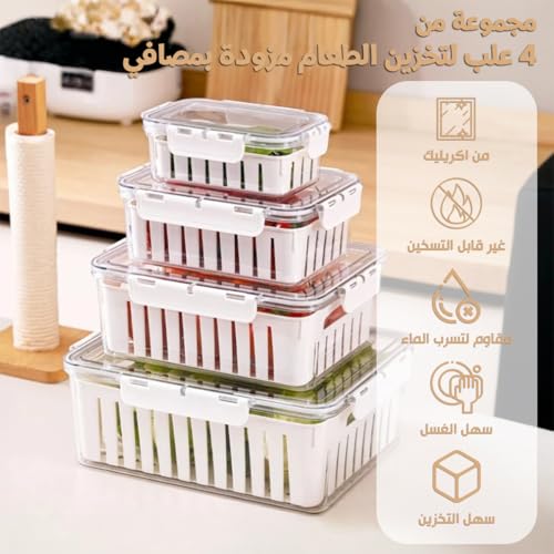 Generic - علب تخزين طعام شفافة مع أغطية، مجموعة من 4 قطع، علب ثلاجة لتخزين الطعام طازجًا، سلة تصريف قابلة للإزالة للمطابخ والثلاجات والدواليب (مستطيلة، أبيض)