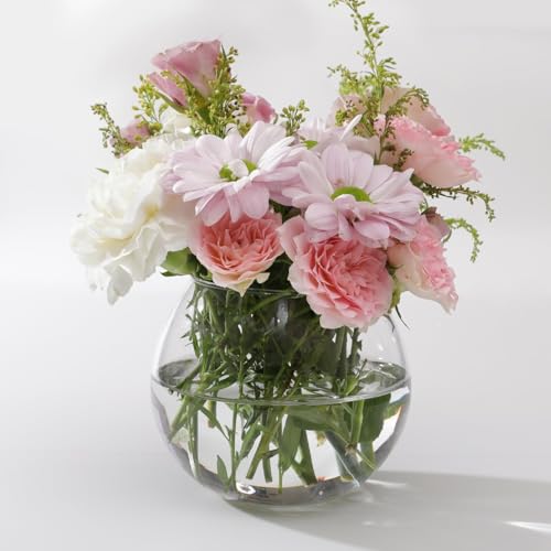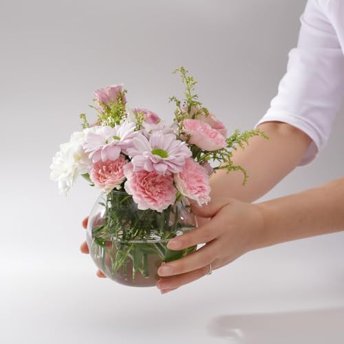 - مزهرية زجاجية أنيقة: تأتي الباقة في مزهرية زجاجية كروية عصرية تناسب جميع أنماط الديكور الداخلي