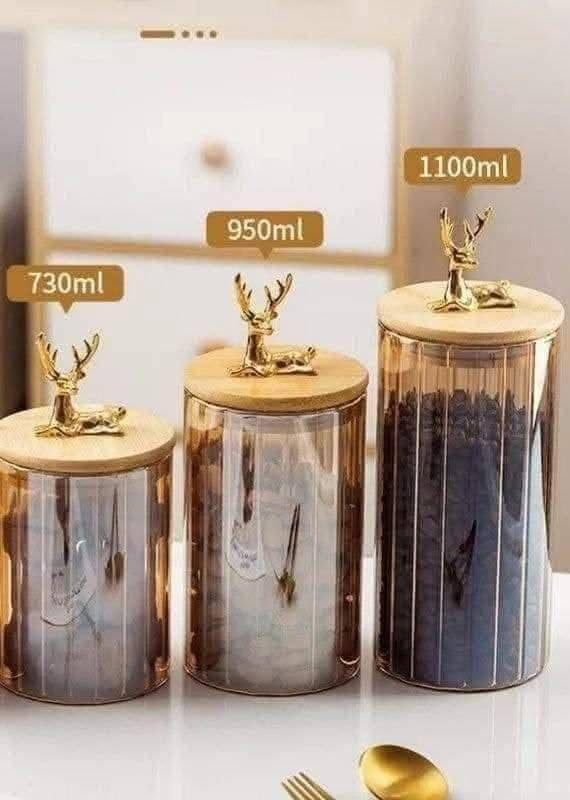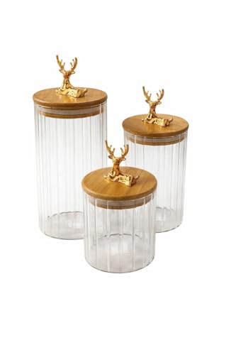 Generic - طقم برطمانات زجاج شفاف بغطاء خشبي ومقبض غزال ذهبي، 3 قطع بمقاسات مختلفة، تصميم مخطط