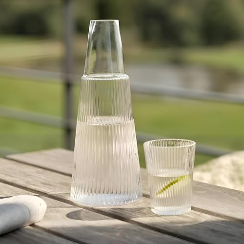 Generic - إبريق زجاجي شفاف قارورة بتصميم محفّر مع كوب مرفق، للتقديم والترطيب بجانب السرير واستخدامات البار المنزلي، بسعة عملية 1 لتر
