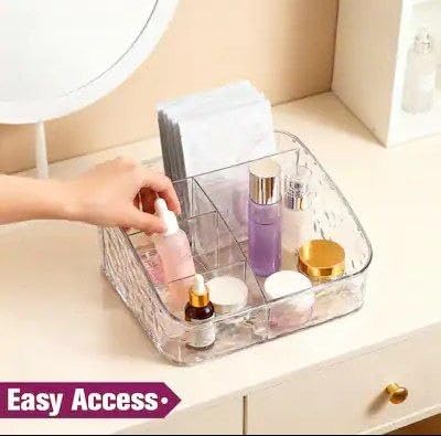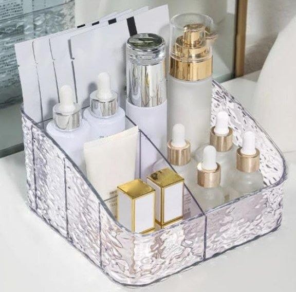 - تصميم شفاف وأنيق: منظم مكياج مصنوع من الأكريليك الشفاف بتصميم عصري يتيح لك رؤية جميع مستحضرات التجميل بسهولة ويضيف لمسة جمالية لطاولة الزينة أو الحمام